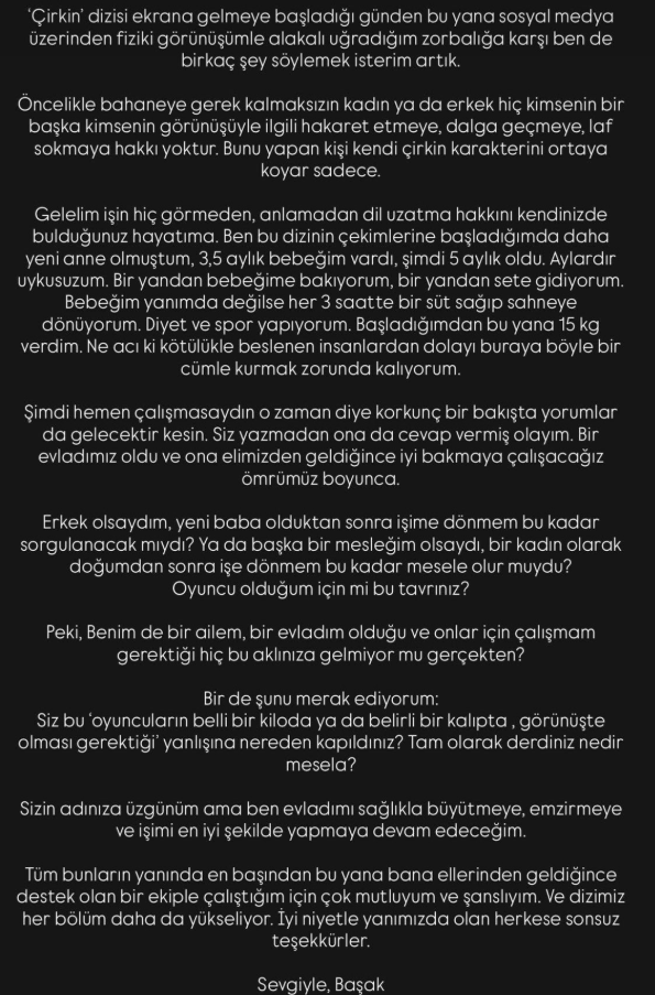 Oyuncu Başak Gümülcineoğlu sosyal medya hesabından son olarak rol aldığı Çirkin dizisindeki rolü ile ilgili gelen ağır eleştirilere cevap verdi. Kilosu ile iligli yapılan yorumlara isyan eden Oyuncu Gümülcineoğlu, yakın zamanda anne olduğunu hatırlattı. Oyuncu açıklamasında “Sizin adınıza üzgünüm ama ben evladımı sağlıkla büyütmeye, emzirmeye ve işimi en iyi şekilde yapmaya devam edeceğim” dedi.